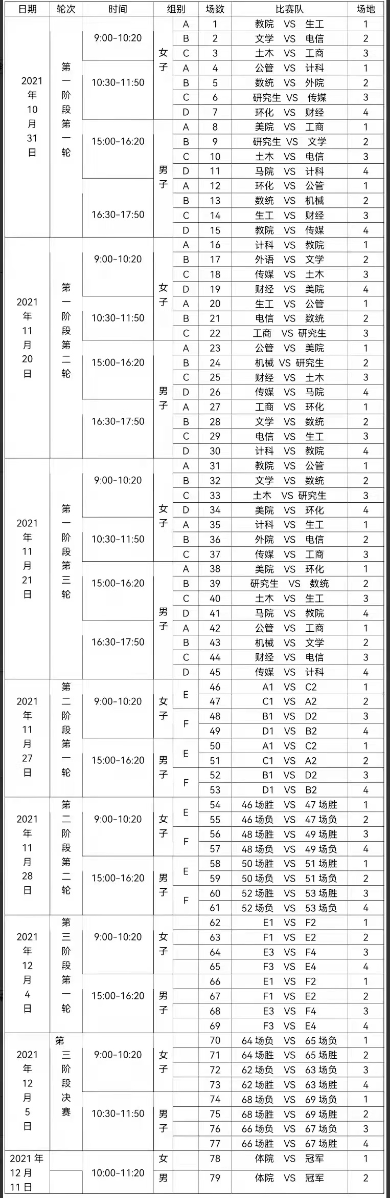 校内各单位: 2021年2026世界杯官方网址秋季球类运动会篮球比赛竞赛日程上传于世界杯官方网站入口2026网站,请相关单位下载查阅。