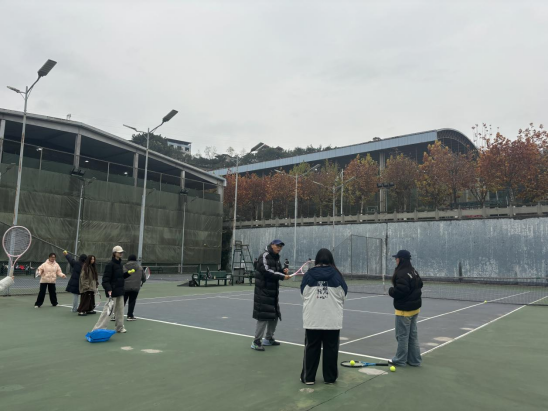 网球场上,冯创老师迎着凛冽寒风,傲然挺立。他们手持球拍,身姿挺拔,每一次挥拍击球都充满力量与技巧。寒风吹拂着他们的衣衫,却吹不散他们对教学的专注神情。在指导员工时,老师们不厌其烦地重复着动作要领,从正确的握拍姿势到流畅的挥拍轨迹,从判断来球方向到调整身体重心,细致入微,面面俱到。他们以自己的专业素养和敬业态度,为员工们打开了一扇通往网球世界的大门,激励着员工们在这片绿色的场地上勇敢追逐运动梦想。